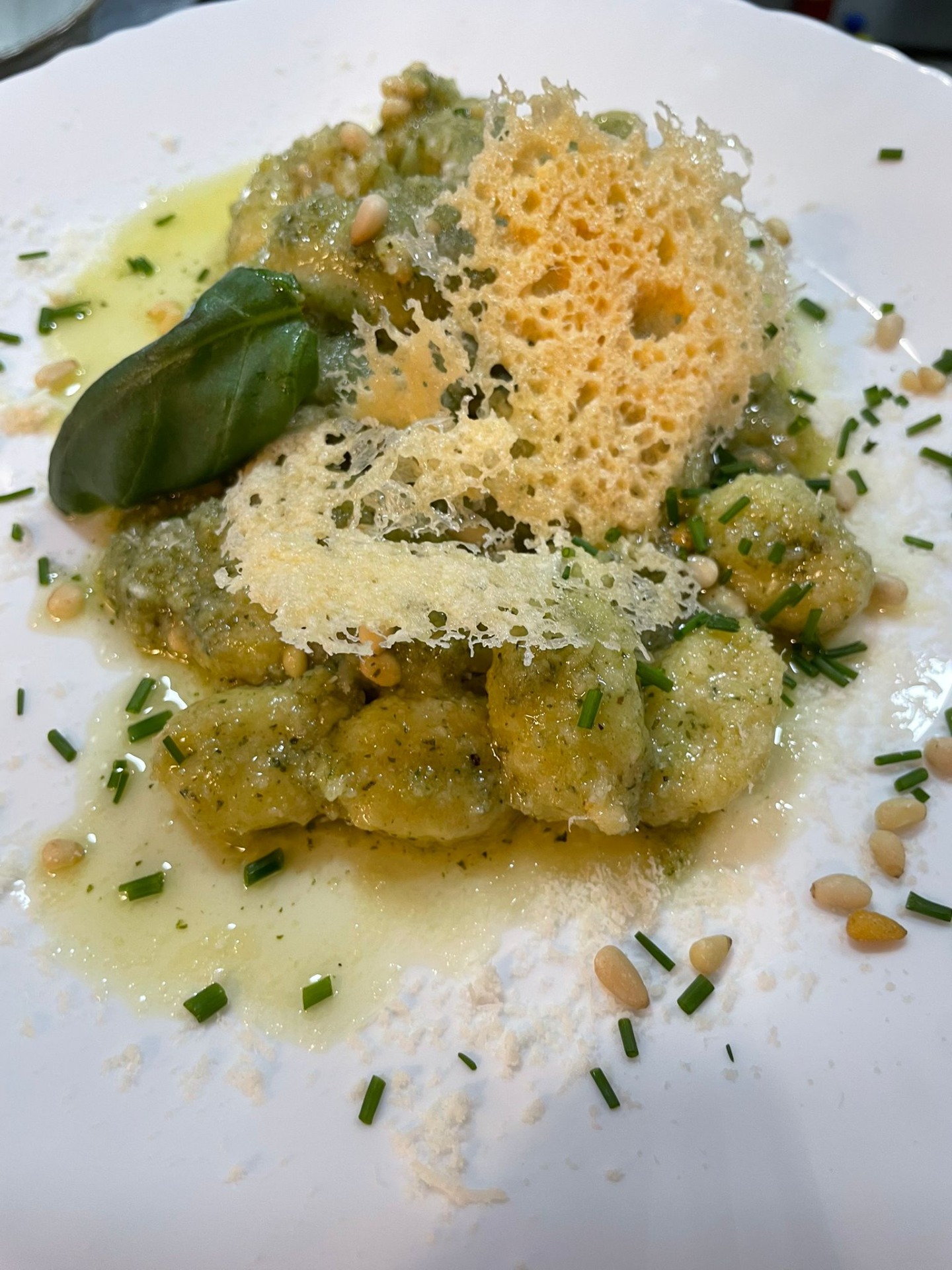 Mozzarella, virutas de jamón ibérico, salsa pesto de pistacho y tomate seco