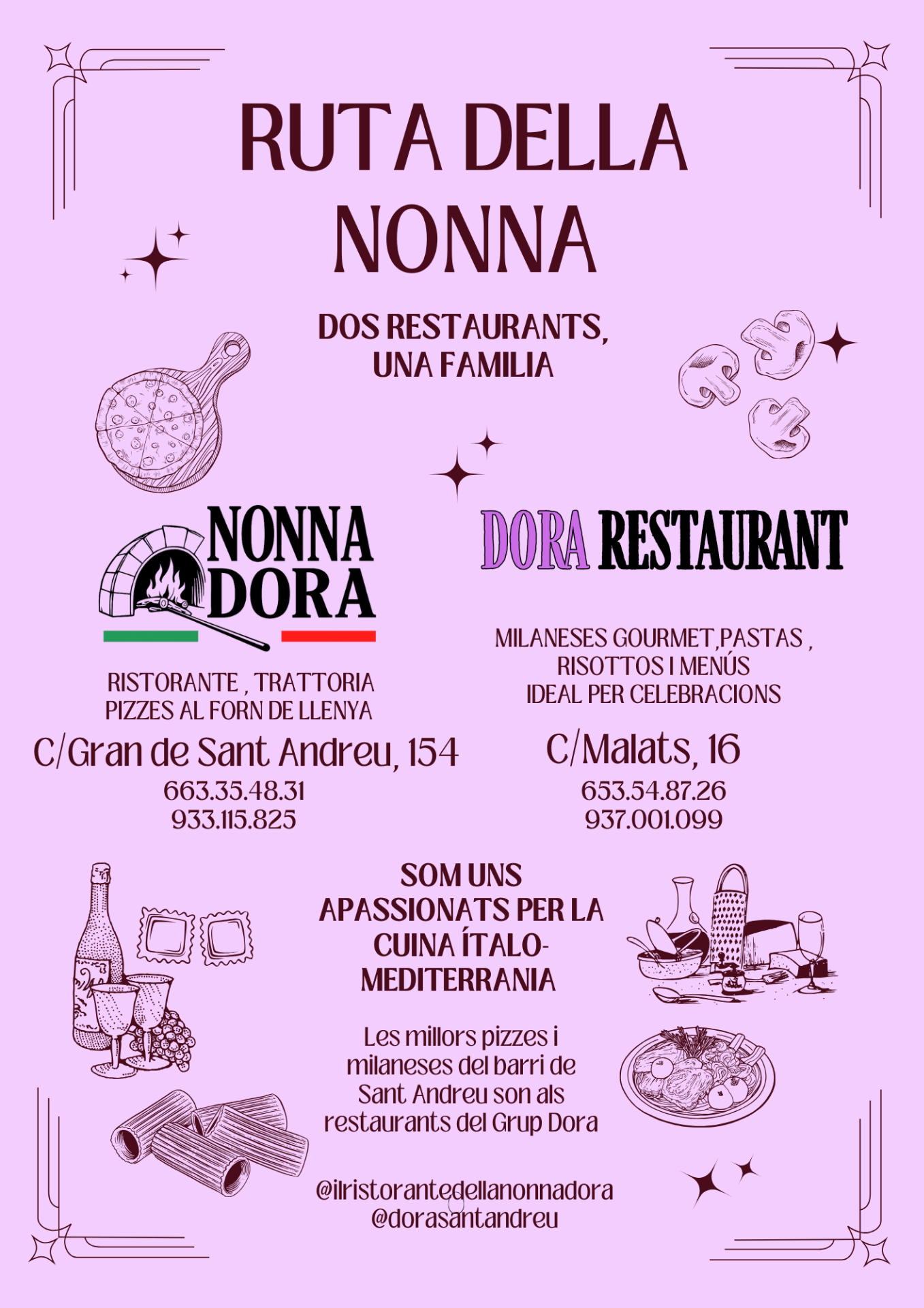 DORA RESTAURANT es el pequeño de la familia Nonna Dora. Siguiendo la reputación de la buena comida y del excelente servicio en Sant Andreu, nace este espacio donde la tradición italiana se fusiona con un toque moderno.